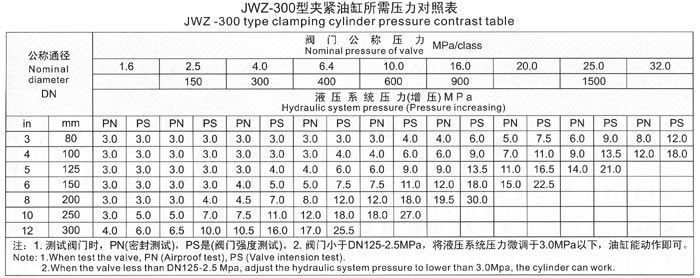 The test range of valve nominal diameter and nominal pressure for JWZ-300 model